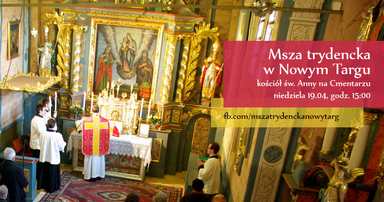 W II Niedzielę po Wielkanocy (Niedziela „Dobrego Pasterza”) 19 kwietnia 2015 r., o godzinie 15:00 zostanie odprawiona Msza święta w Nadzwyczajnej Formie Rytu Rzymskiego („Msza trydencka”) w Kościele św. Anny w Nowym Targu (na Cmentarzu).